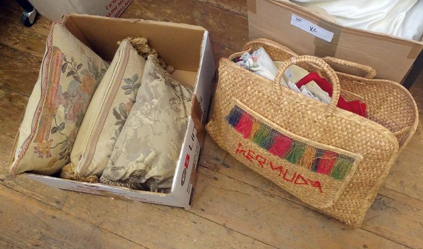 Two pairs of full-length lined and interlined jacquard curtains, three cushions and a quantity of table linen in a straw holiday souvenir basket (2 boxes)