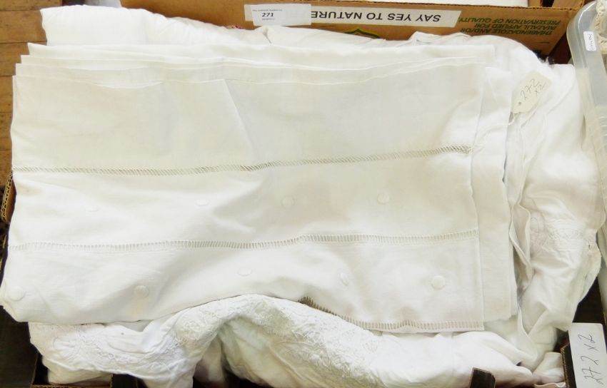 French linen sheet, drawn thread with embroidered buttons and a large quilted coverlet with appliqued lace (2)