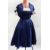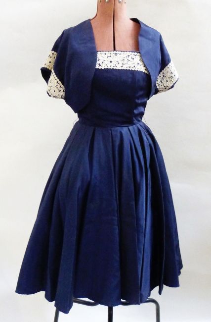 Blue satin 1950's cocktail gown, the bodice trimmed with lace and a bolero top, a 1950's black satin evening gown, strapless with jet embroidery and ruched bodice and a silk full-length evening gown, heavily decorated with faux-pearls and keyhole and bow decoration to the front neckline (3)