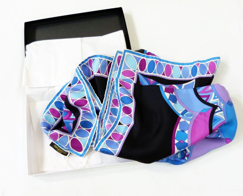 Emilio Pucci silk scarf with black ground in shades of purples and blues, within a Bloomingdales box with Bloomingdales tissue paper