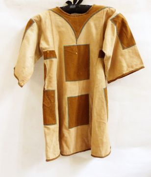 1920's beaded gown, the front panel cut away, a pair of vintage wool and suede jodhpurs made by H Huntsman & Sons, 11 Saville Road and an ethnic child's linen dress with patch stitched decoration (3)