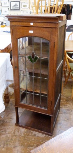 Arts & Crafts style oak corner display cabinet having four shelves enclosed by leaded and stained glass panel and door, undershelf below, 69cm wide across the corners