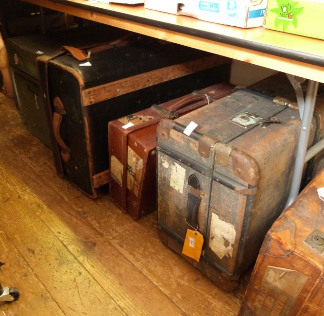Two vintage trunks, a leather suitcase carrying shipping labels and a large vintage tin travel trunk (4)