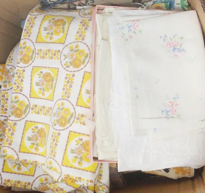 One large candlewick bedspread in pink, a green candlewick bedspread, two seersucker coverlets and a quantity of vintage dress materials, remnants and other pieces (2 boxes)