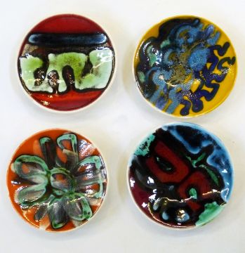 Four Poole Delphis pottery circular trinket dishes, model no.49 by Angela Wyburgh (1968-72), Carol Holden, Patricia Churchouse (1962-65) and Jean Millership (1966-69), some with iridescent and blue glazes