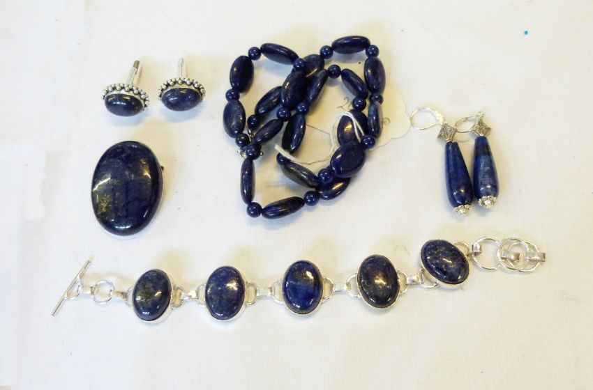Quantity of lapis lazuli jewellery comprising a necklace, a brooch, a bracelet, a pair of drop earrings and a pair of cufflinks
