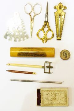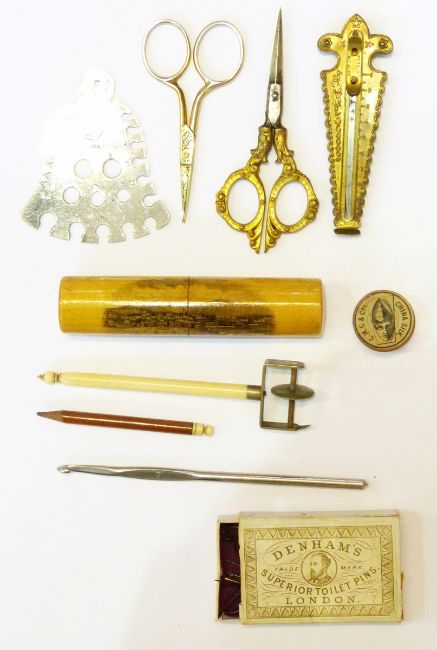 Victorian souvenir needlecase depicting a scene of Ventnor, a bakelite needlecase, a chrome retractable pin storage, a "Wavery & Son Quadruple Golden Casket" needlecase and various other sewing accessories
