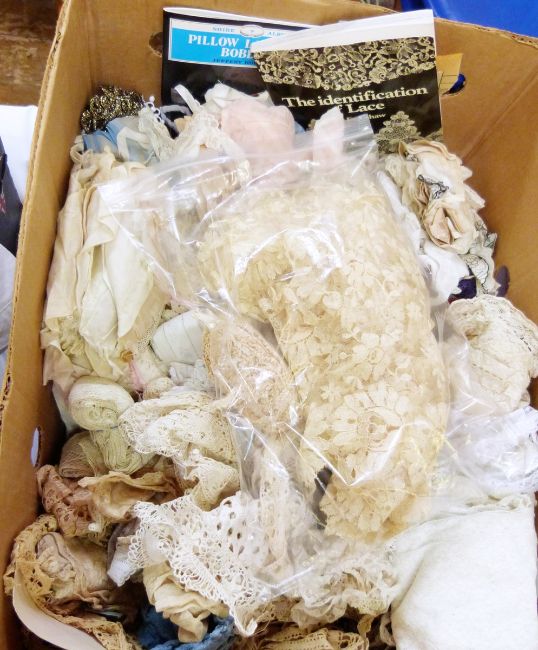 Large undyed lace shawl with a small tear, assorted lace, crocheted and embroidered trimmings with Earnshaw, Pat "The Identification of Lace" paperback and another related volume (1 box)