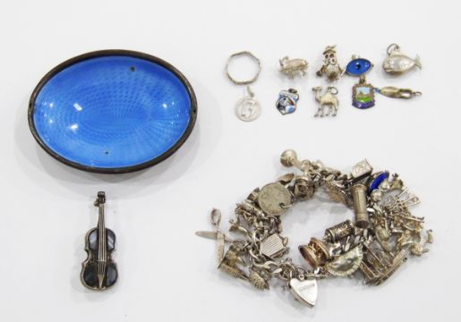 Silver curb-link charm bracelet hung with numerous silver charms, 91g approx., further loose charms, a silver-coloured brooch modelled as a cello with agate panels and a silver-coloured dish of oval form with turquoise enamel