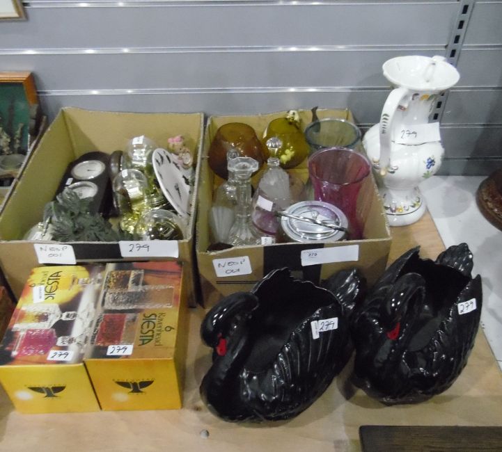 Pair of Devon Dartmouth black swan planters, a continental-style two-handled urn, various glassware, a wooden and steel ice bucket, various clocks under domes and Ravenhead Siesta glasses, boxed