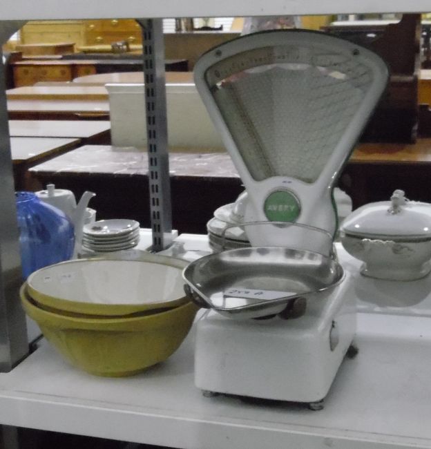 Vintage Avery ceramic weighing scale with stainless steel bowl and two large R G Green mixing bowls