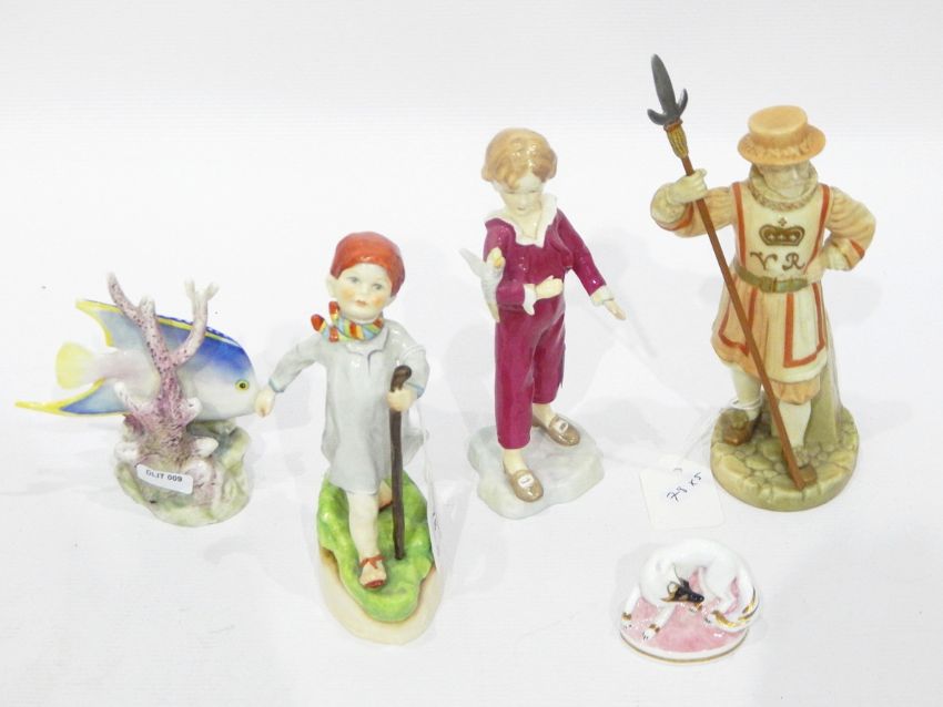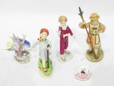 Quantity of Royal Worcester models including blue angel fish amongst coral, blush model of a Victorian beefeater, Country Life series model of a fox and two Doughty figures 'The Parakeet' and 'Thursday's Child Has Far to Go' (damaged) (5) CONDITION REPORT: Beefeater restoration to hand and spear. Angel fish chipped, Parakeet has broken wings. Thursdays Child has broken arm and leg