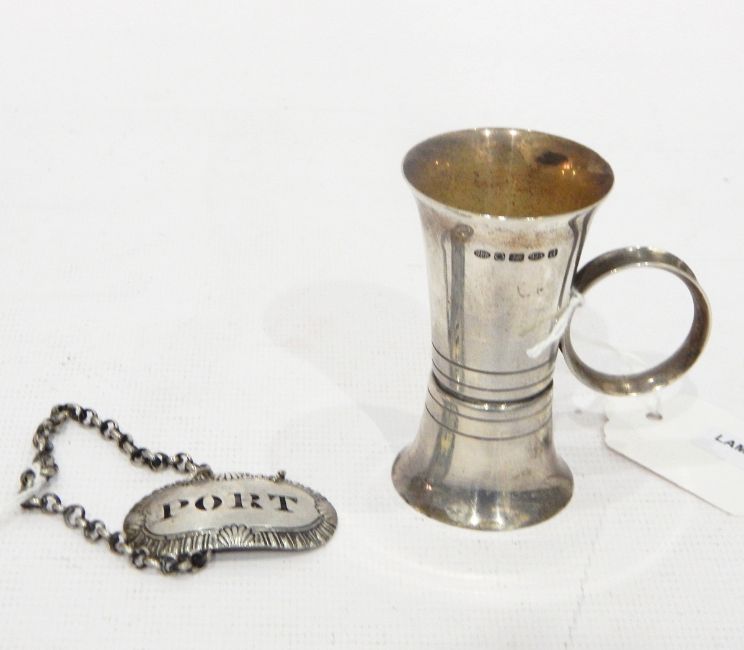 George III silver wine label by Thomas & James Phipps, probably London 1819, of oval form with pierced lettering 'Port' within a gadrooned shell border, 4cm wide and a silver double-ended measure cup by Harrison Bros & Howson Ltd, Sheffield 2003 of flared form with ring handle, 7cm high (2)