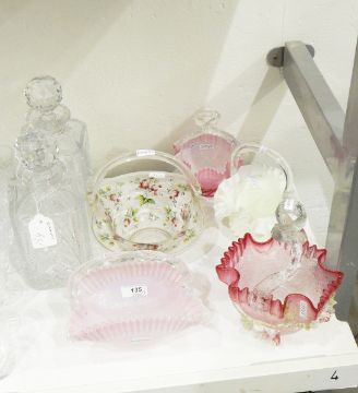Victorian glass basket painted with rosebuds, a Stevens & Williams-style glass basket, crinkle glass with applied flowers, the handle applied with a twisted knot and three other similar (5)