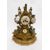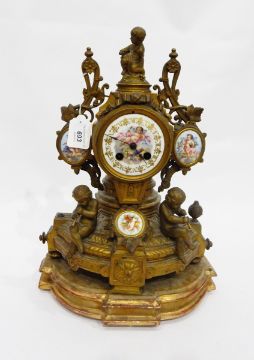 French porcelain and gilt brass mantel clock, the circular painted porcelain dial decorated with Cupid within Roman numerals, flanked by further porcelain plaques, the case with cherub and scroll decoration, on gilt wooden base 42cm high