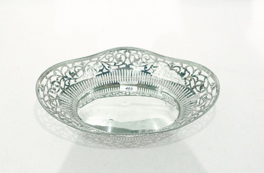 Silver-coloured metal basket, boat-shaped with wavy beaded border and scroll cut card pierced sides, 31.5cm wide