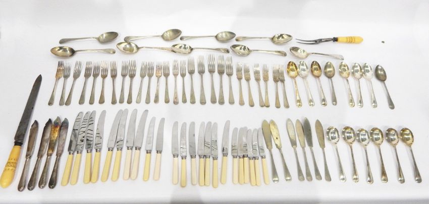 Quantity of EPNS flatware including bone-handled knives and a carved bone-handled carving knife and fork (1 box)