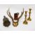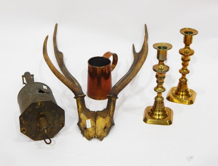 John Linwood brass meat jack, a pair of brass candlesticks, a wood-framed and glass washboard and various other items