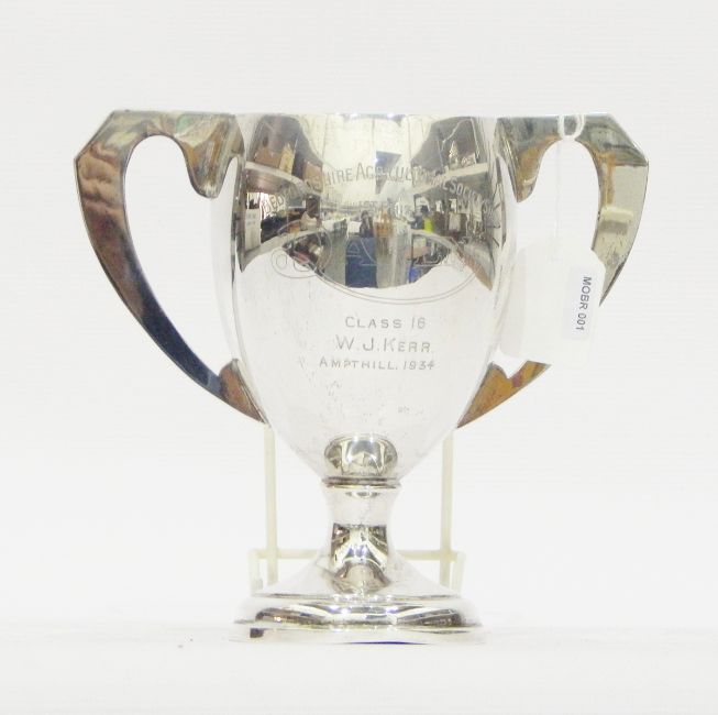 Silver two-handled trophy by Alexander Clark & Co Ltd, Birmingham 1934, presentation inscription for Bedfordshire Agricultural Society Show, 19cm high, 10oz approx.