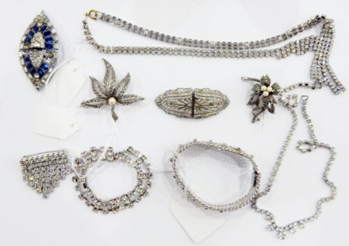 Mid 20th century blue and colourless paste fringe necklace, another similar clear paste example of cross-over design, further vintage diamante fringe necklaces, brooches, bracelets, etc.