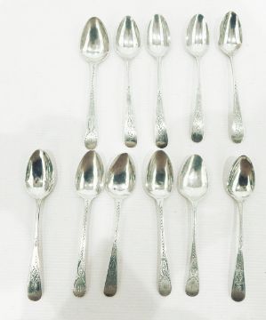 Set of five George III provincial Old English pattern silver teaspoons by Dorothy Langlands, Newcastle circa 1810, each initialled and with bright cut decoration and a sixth silver teaspoon to match together with a set of five George III bright cut Old English pattern silver teaspoons by Peter, Ann and William Bateman, London 1804, 4oz (11) (all with damage to bowls)