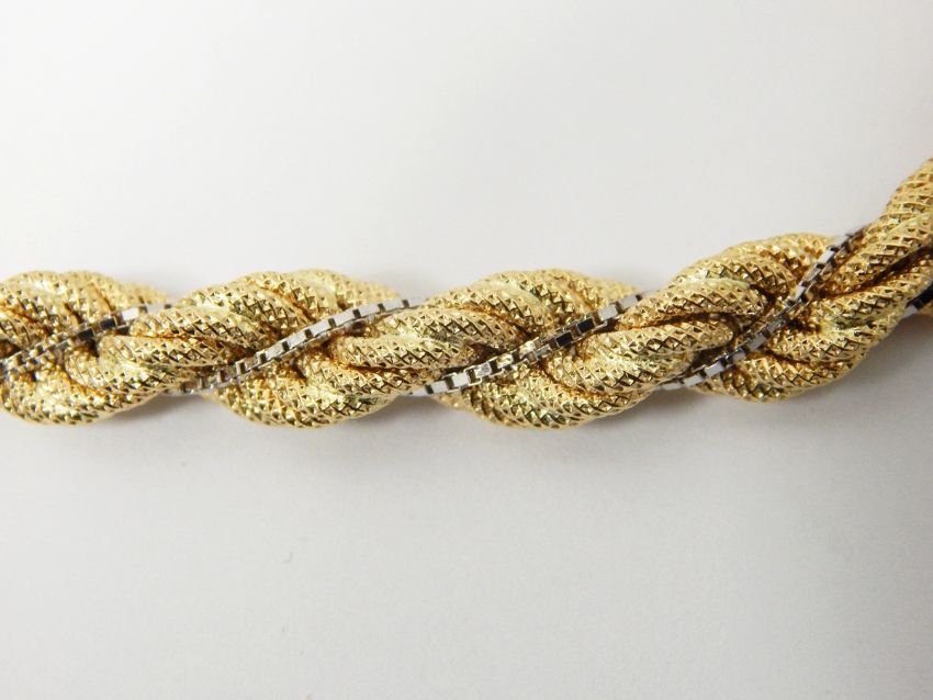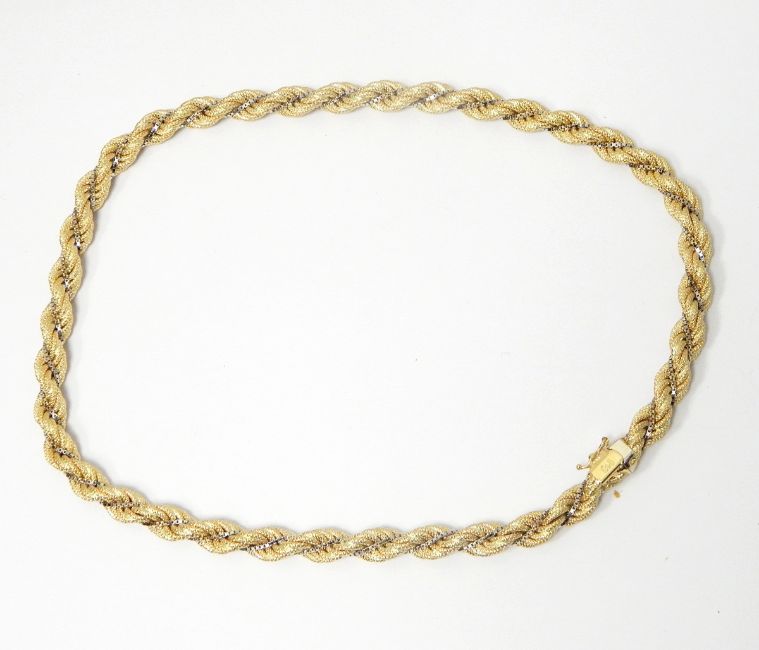 Gold rope-twist necklace, the textured yellow gold rope-twist interlinked with a white gold box link chain, marked 750, approx. 45gm