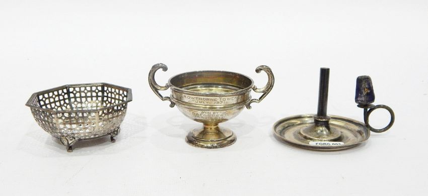 Small silver bowl by Synyer & Beddoes, Birmingham 1942, of pierced octagonal design, on four feet, 9cm diameter, a small two-handled silver cup and a silver spool and thimble holder modelled as a miniature candlestick, approx. 3oz (3)
