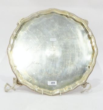 Silver salver by Thomas Bradbury & Sons Ltd, Sheffield 1927, of shaped circular form with gadrooned border, on four claw and ball feet, with facsimile signatures to centre, 37cm diameter, 41oz approx.