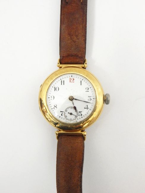 Gentleman's 18ct gold open-faced strap watch, the circular enamel dial with subsidiary seconds dial, with leather strap and 18ct gold buckle