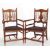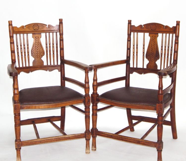 Pair of early 20th century beech and oak elbow chairs, the rail backs with carved cresting rail and central splat, outswept arms and on turned legs