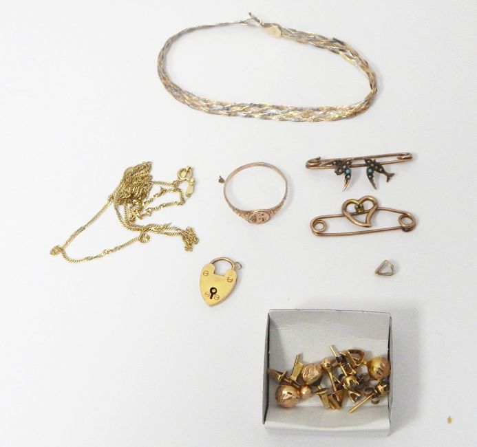 9ct three-colour gold bracelet of woven design, 2g approx., a 9ct gold bracelet padlock clasp, a gold-coloured fine curb-link chain marked 14K and other items