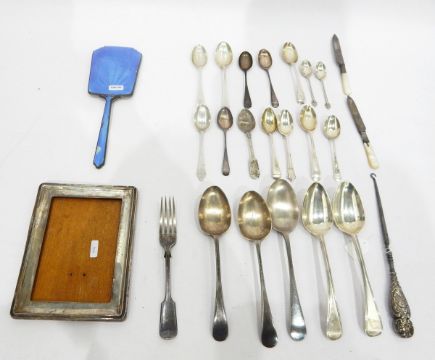 Two Georgian Old English and thread pattern silver tablespoons, various silver teaspoons, a silver photograph frame of rectangular form and other items of silver plate, enamel dressing mirror, etc.