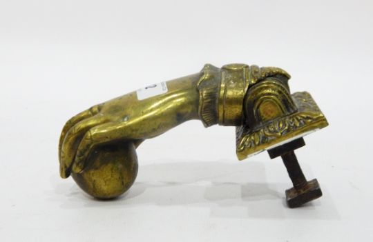 Victorian brass door knocker modelled as a lady's hand with lace cuff and bracelet, 13cm long approx.