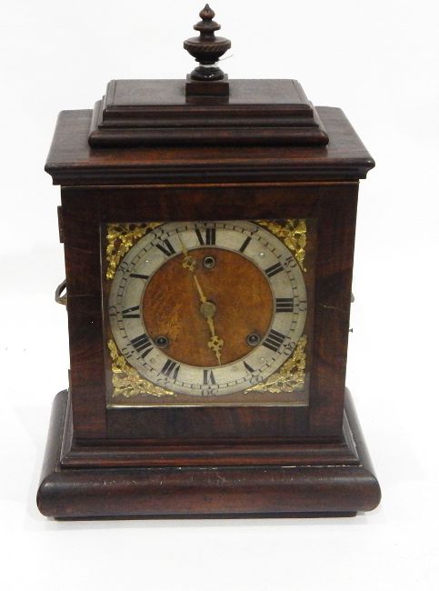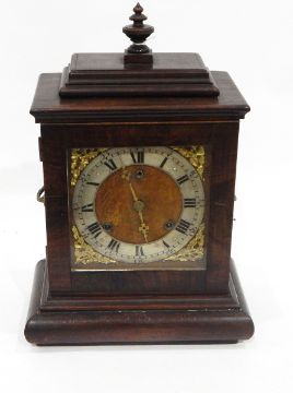Regency-style mahogany bracket clock with urn finial, the dial with silvered chapter ring and Roman numerals, eight-day striking movement, raised on a plinth base, 42cm high