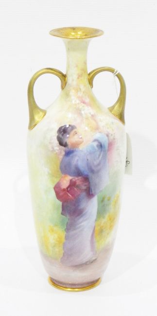 Royal Dalton baluster-shaped two-handled bottle vase depicting Chinese woman picking blossom, signed 'L Bilton', entitled on base 'Cherry Blossoms', 26cm high and a Dresden porcelain figure group of two girls dancing (2) PLEASE NOTE THIS IS ROYAL DOULTON Live Bidding: Worn gilt handles. Restored spout