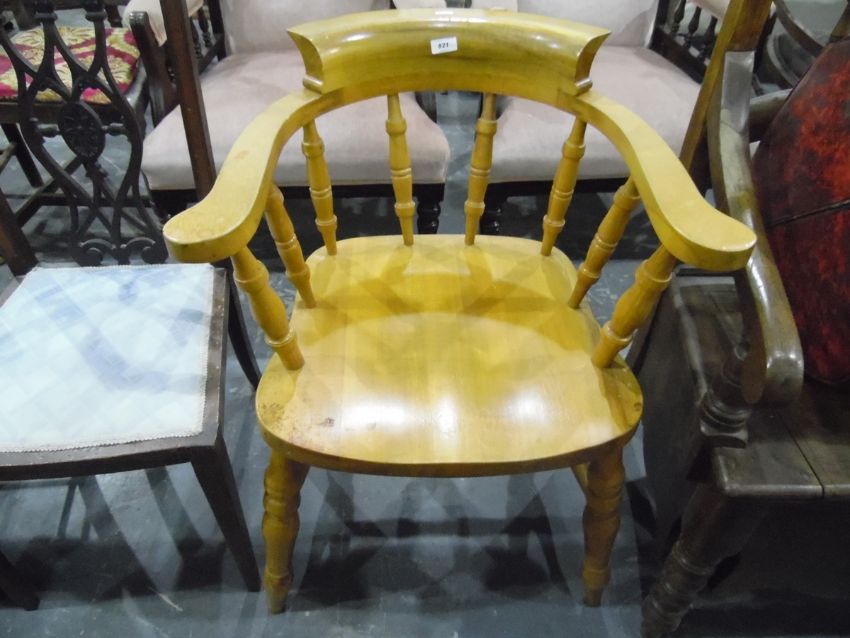Beech framed smokers/captains chair with turned spindle back and on turned supports