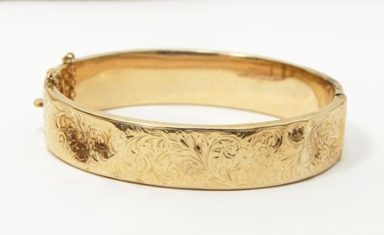 9ct gold hinged bangle with engraved decoration, 14g approx.