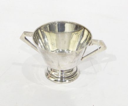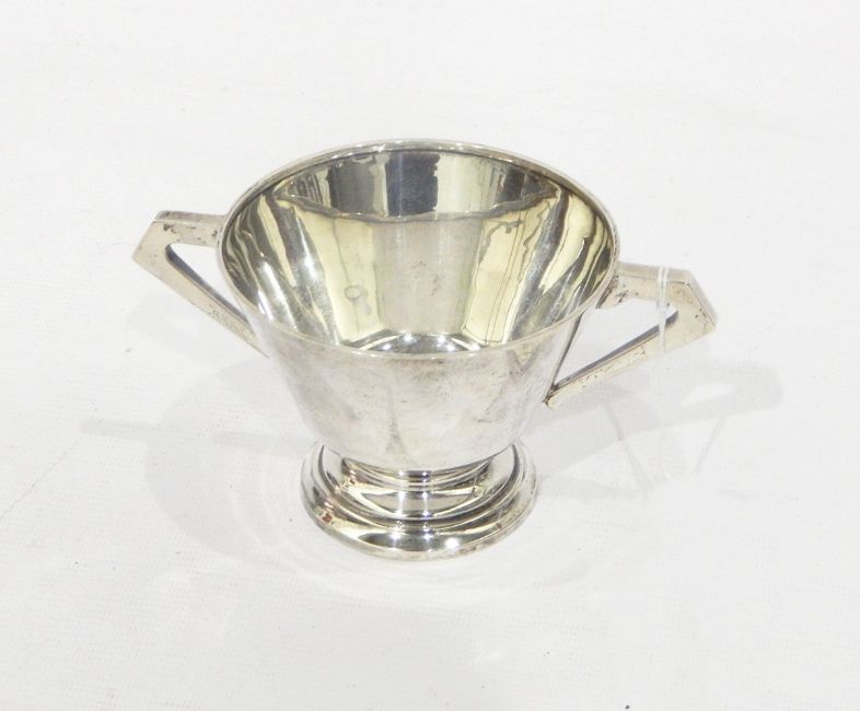 Silver two-handled bowl by Walker & Hall, Sheffield 1910, of flared circular form with two angular handles, on circular foot, 7.5cm high, approx. 4oz