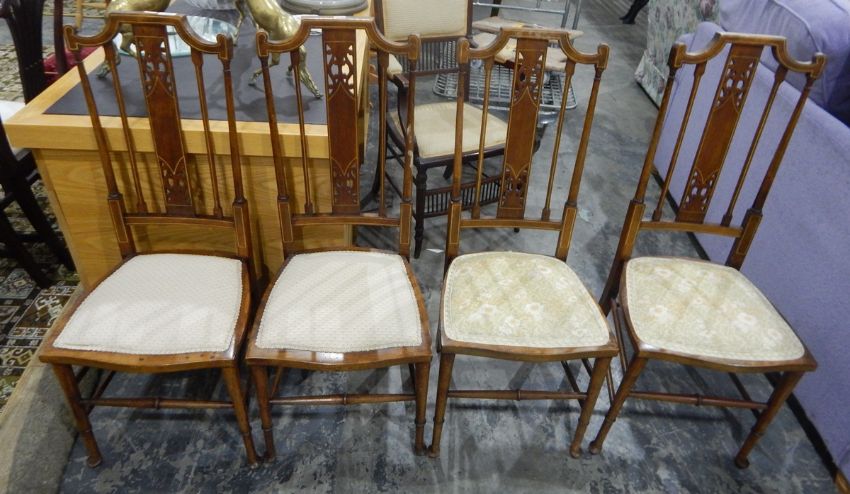 Set of four Edwardian walnut chairs, the backs with strung decoration and pierced splats