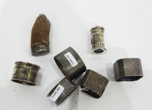 Pair of silver napkin rings of square design, with engine-turned sunburst decoration, inscribed 'Joan and Donald', two other silver napkin rings and various other items