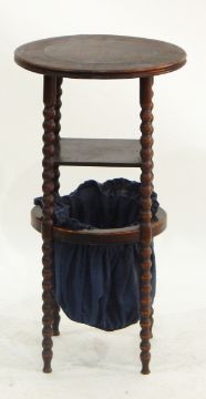 Victorian lacquered tilt-top games table, the square top with inlaid mother-of-pearl games board over a turned stem on tripod base, and another sewing table, of circular form on four turned supports (2)