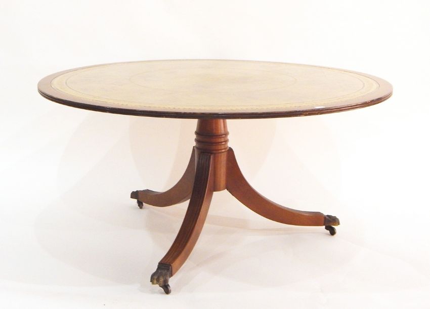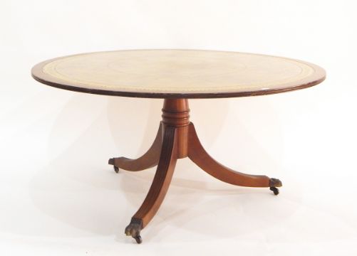 Mahogany circular occasional table raised on turned pedestal with reeded swept tripod supports, hare claw toes and brass castors, having tooled inset leather top and a Lloyd Loom bedroom tub chair (2)