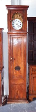 19th century French longcase clock, the circular enamel dial with Roman numerals and inscribed 'Vidal a Lavit', the embossed brass arch above decorated with figures and wagon, in walnut case
