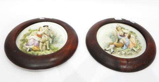 Pair of tinted bisque relief-moulded plaques of lovers, in wooden circular surrounds, 35cm diameter (damaged) CONDITION REPORT: Broken feet to one