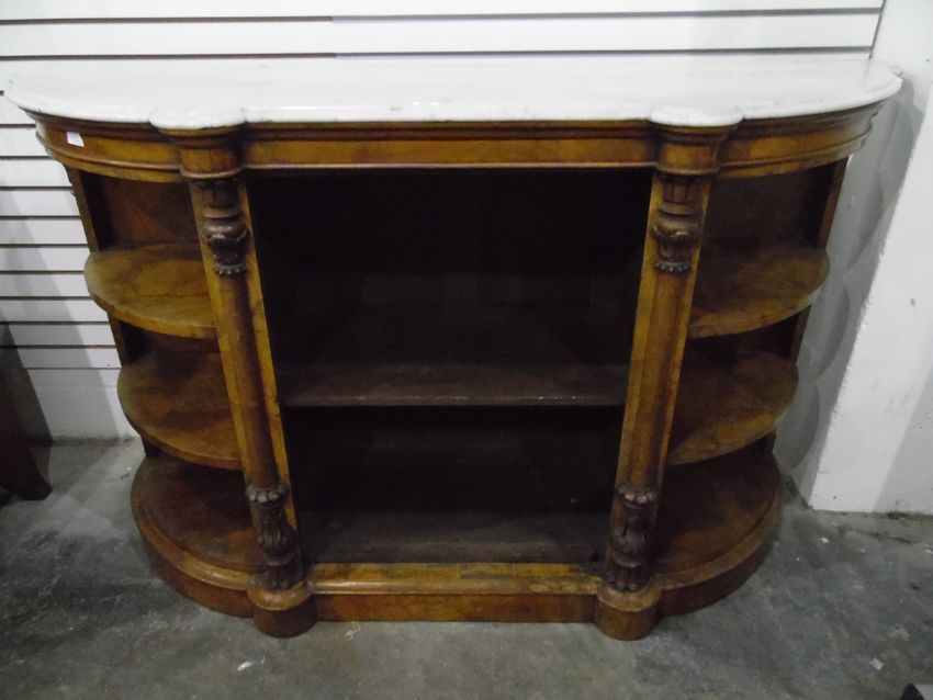 Victorian walnut credenza, the shaped marble top over a central cupboard flanked by open shelves on plinth base (missing cupboard door) 145cm wide