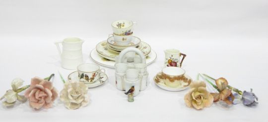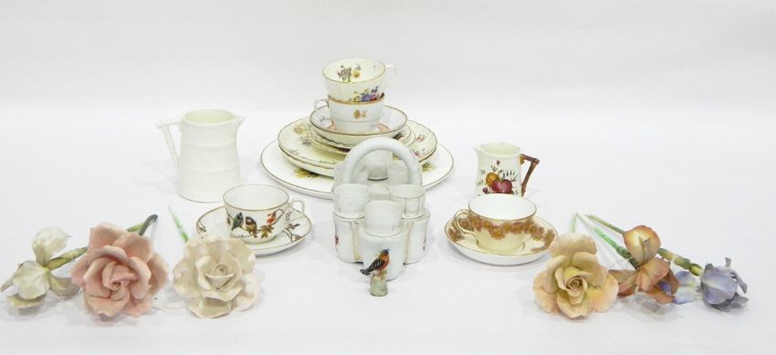 Quantity of decorative china to include Victorian Worcester cup and saucer, further similar cups and saucers, barrel-shaped jug with printed fruit decoration, another larger and tinted bisque flower stems, etc.