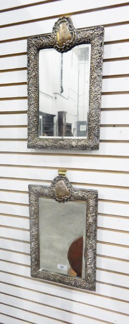 Pair of Edwardian silver photograph frames, each rectangular and with vacant shield-shaped cartouche surmounting, the frames embossed with rococo scrolls, flowerheads and trelliswork, Chester 1901, 41cm x 25cm