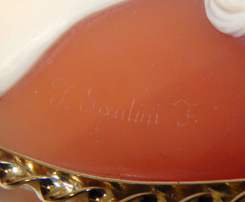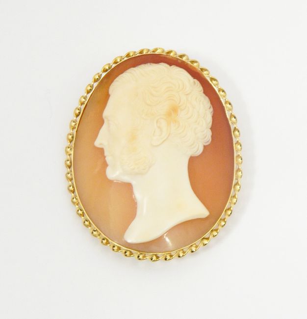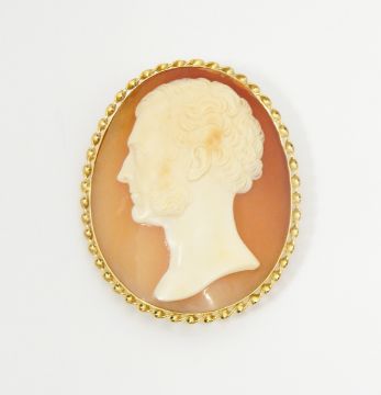 Signed shell cameo brooch, the oval cameo depicting the profile of a man, signed "T Saulini F" in later gold coloured rope-twist frame, marked 14K 585, 6 x 5cm