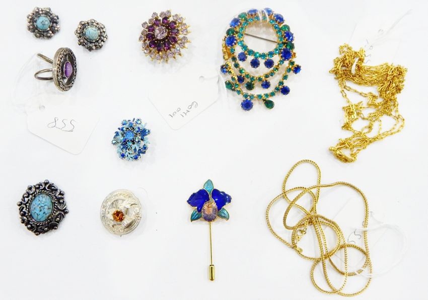 Scottish silver brooch of circular form with central paste set thistle head, an Austrian blue and green paste brooch of circular form with swags beneath and various other items of costume jewellery