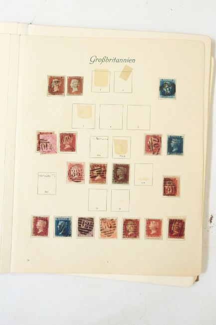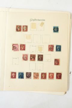 Album and contents of GB stamps on leaves including 2s blue SG118, 8d orange 156, 1s SG196, 2s 6d and 5s jubilee, Edward VII mint examples, George V 2s 6d, 2 x 5s (1915), etc.